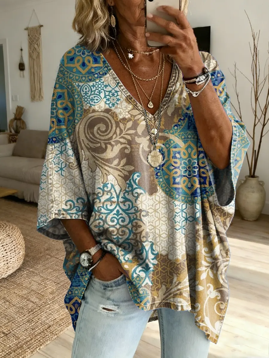 Women's Retro Bohemian-Style Tribal Floral Art Print Casual Washed Cotton Denim Jacket