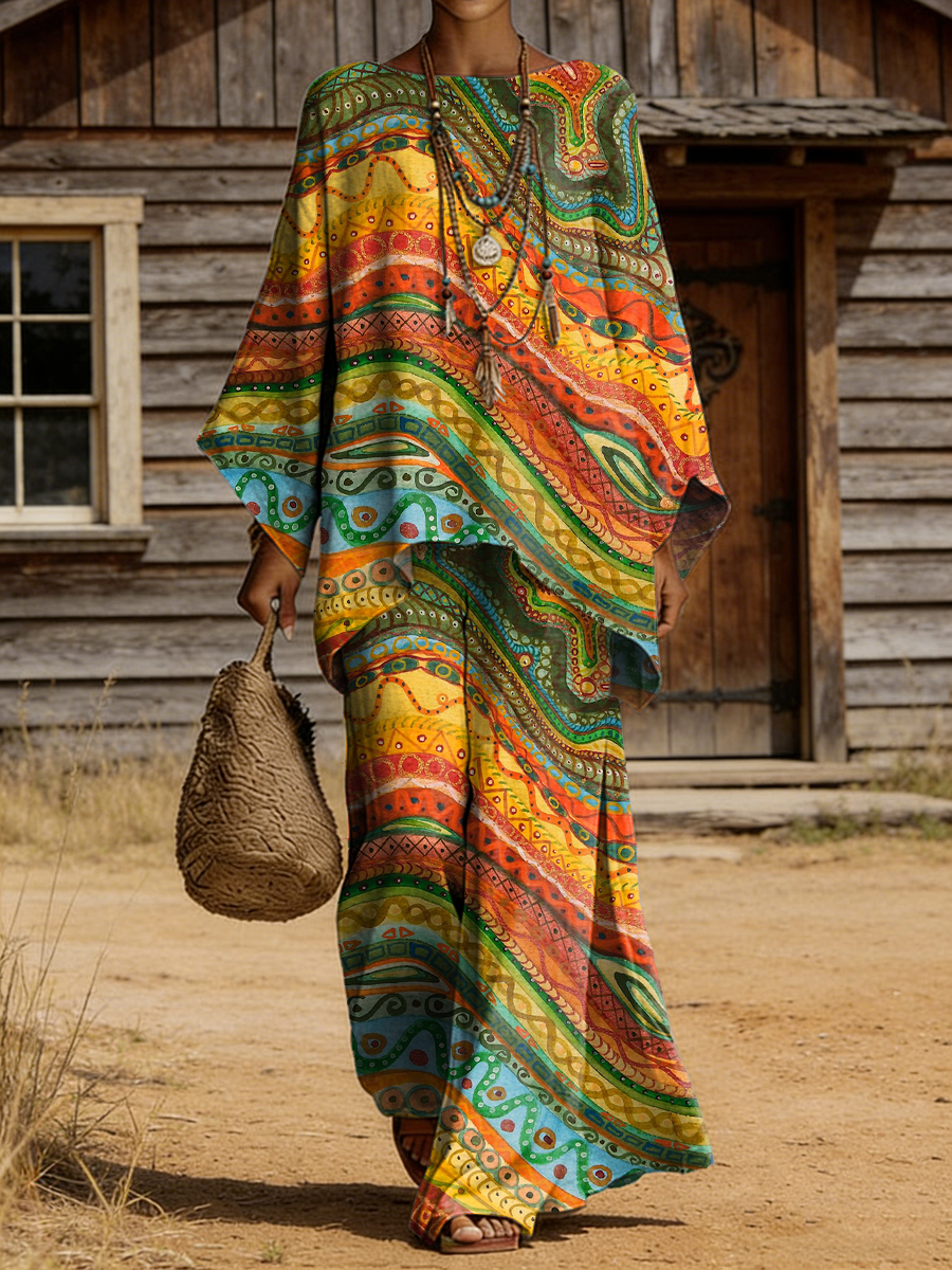 Women's Retro Colorful Bohemian Art Print Casual Long Sleeve Round Neck Suit