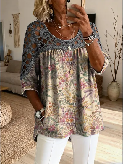 Women's Retro Ethnic Floral Art Print Casual Three-quarter Sleeve Round Neck Top