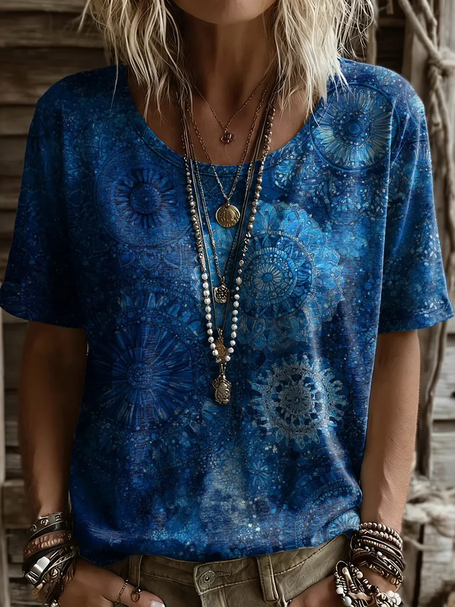 Women's Retro Ethnic Floral Print Round-neck Short-sleeve T-shirt