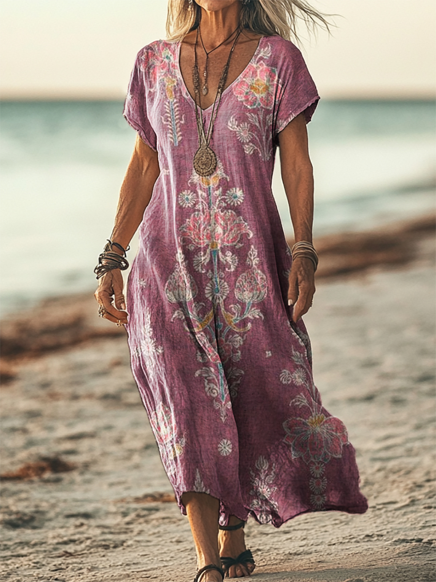 Women's Retro Ethnic Flower Art Print Short Sleeve Pocket Cotton Linen Dress