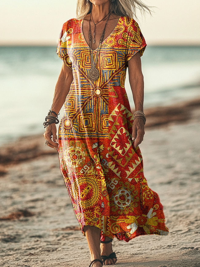 Women's Retro Ethnic Flower Print Pocket Cotton Dress