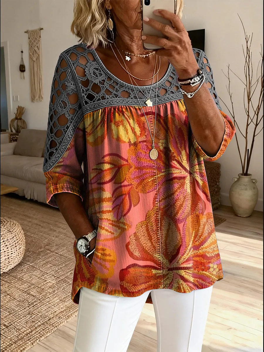 Women's Retro Floral Art Print Casual Three-quarter Sleeve Round Neck Hollow-out Top