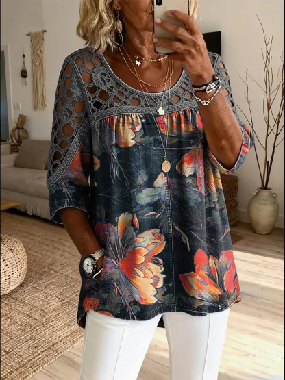Women's Retro Floral Art Print Casual Three-quarter Sleeve Round Neck Hollow-out Top