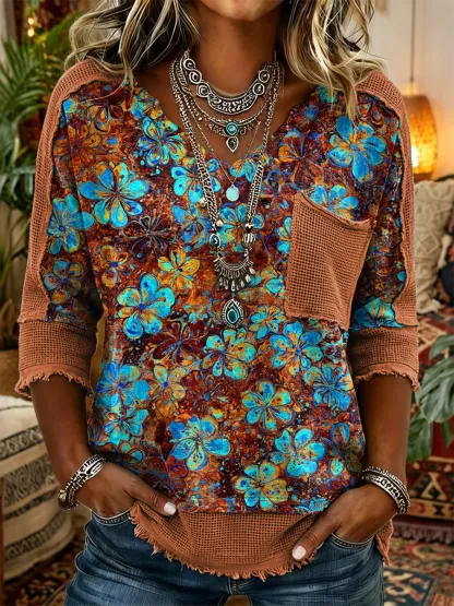 Women's Retro Floral Color-blocked Art Print Casual Three-quarter Sleeve V-neck Patchwork Cotton Linen Top