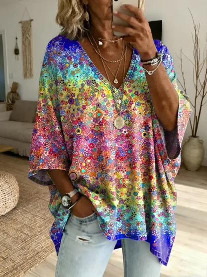 Women's Retro Gradient Colorful Petal Art Print Casual Washed Cotton Denim Top