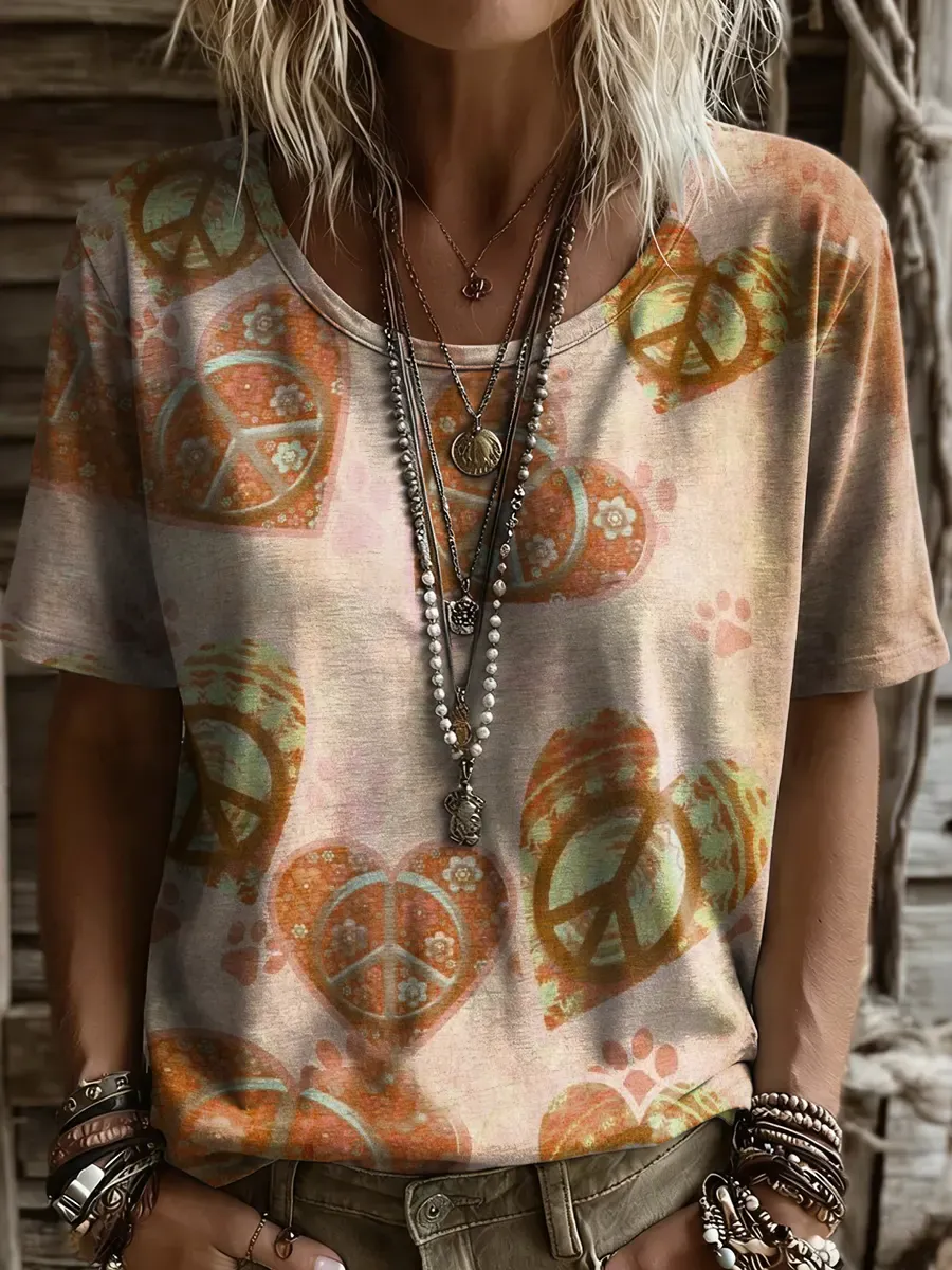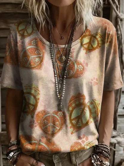 Women's Retro Hippie-Style Love Artistic Print Casual Crew Neck T-Shirt