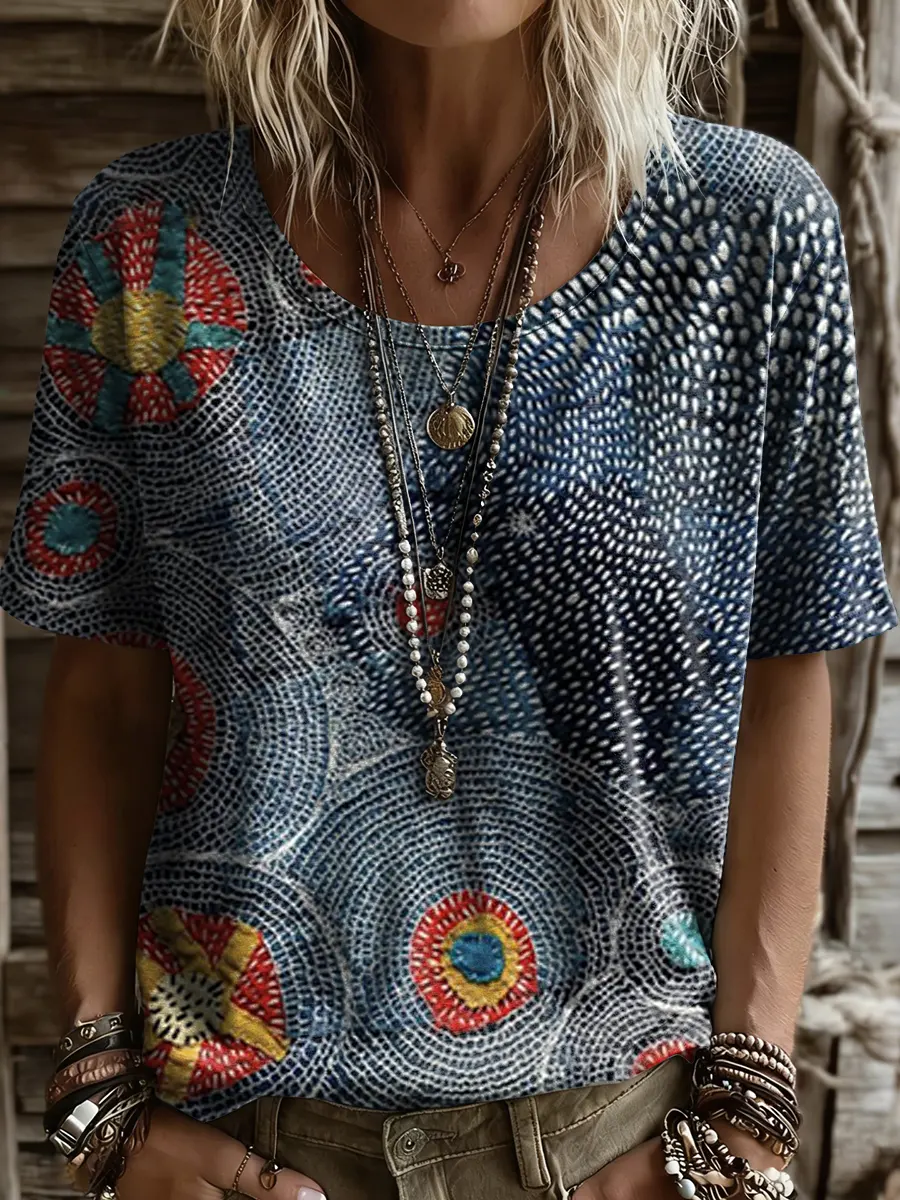 Women's Short-sleeve T-shirt With Artistic Line Print And Round Neckline
