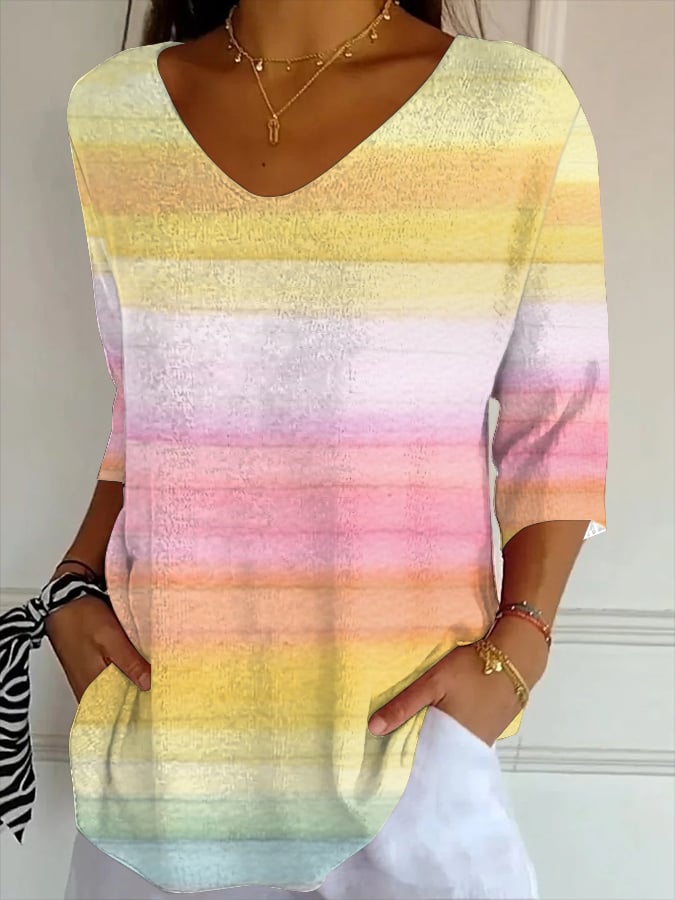 Women's Summer Breast Cancer Pink Gradient Print Long Striped T-shirt