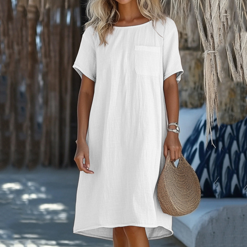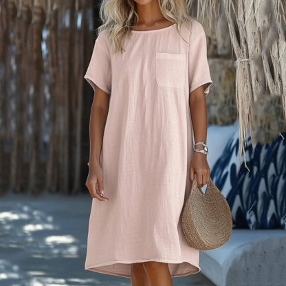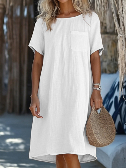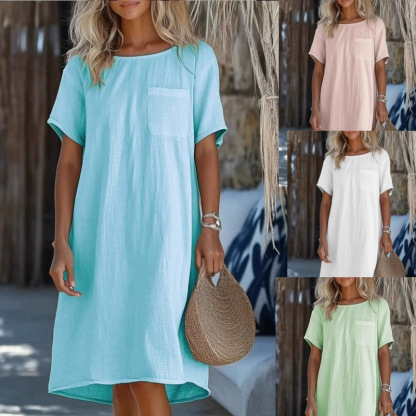 Fashionable And Casual Cotton And Linen Round Neck Short Sleeve Dress