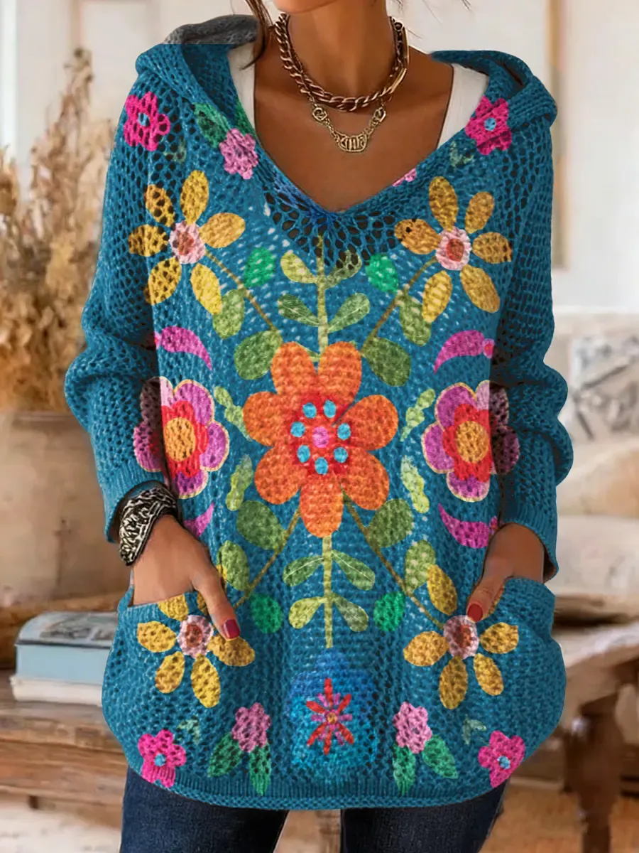 Women's Bohemian Floral Art Print Long-Sleeved Hooded Cover-Up