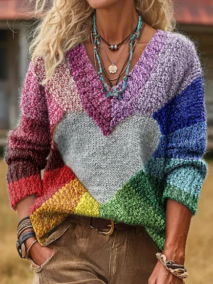Women's Colorful Heart-patterned Artistic Print Knitted V-neck Pullover Sweater