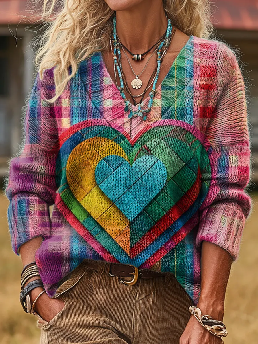 Women's Colorful Plaid Heart Art Print Knitted V-neck Pullover Sweater