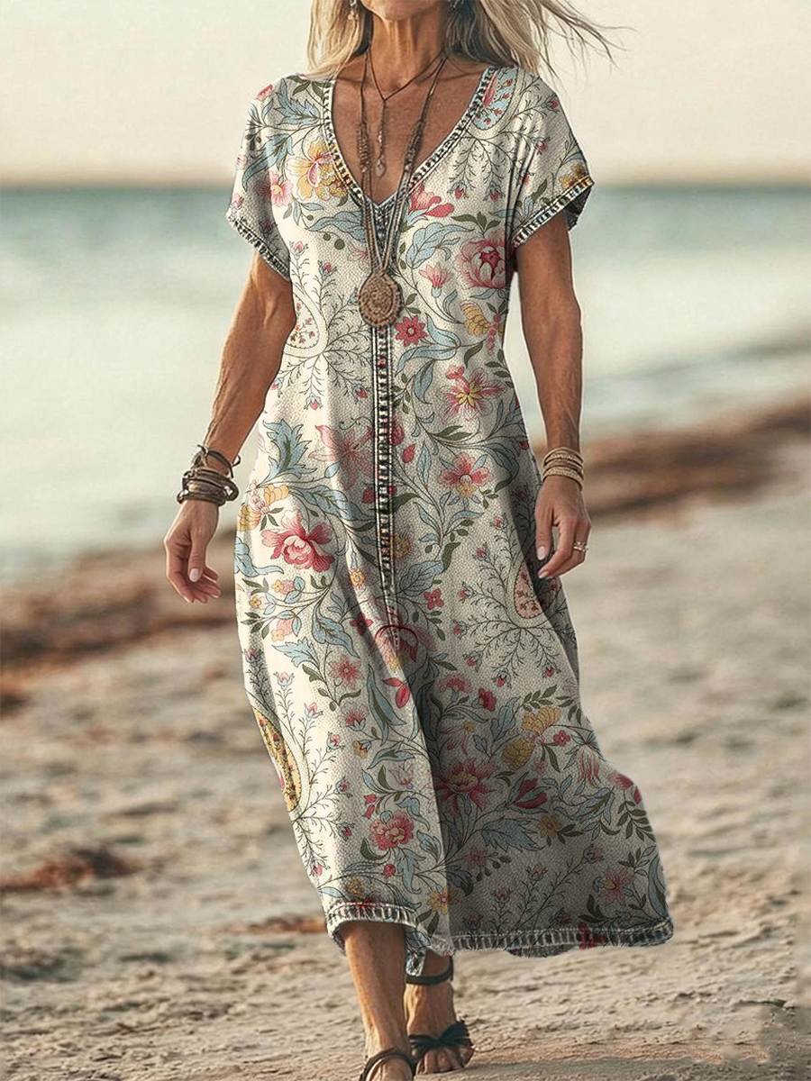 Women's Retro Bohemian Art Print Casual Short-Sleeve V-Neck Washed Cotton Denim Dress