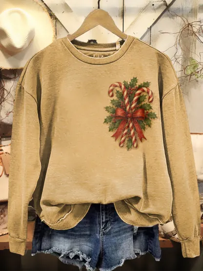 Women's Retro Christmas Art Print Casual Long Sleeve Crew Neck Sweatshirt