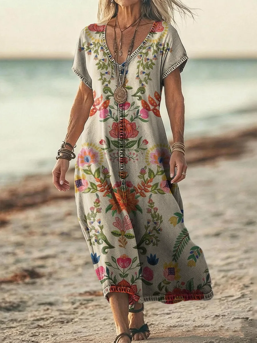 Women's Retro Ethnic Floral Art Print Casual Short-Sleeve V-Neck Washed Cotton Denim Dress