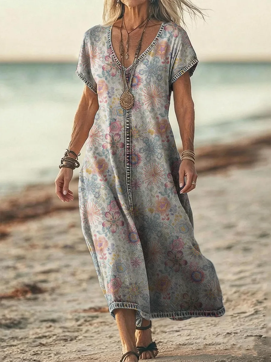 Women's Retro Floral Art Print Casual Short-Sleeve V-Neck Washed Cotton Denim Dress