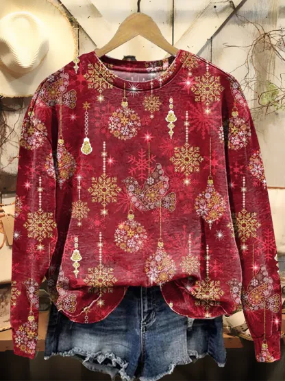 Women's Retro Red Bird Snowflake Christmas Art Print Casual Round Neck Pullover Sweatshirt