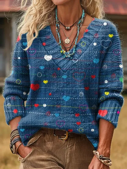 Women's Stylish Retro Striped Pattern Art Print Knitted V-neck Pullover Sweater