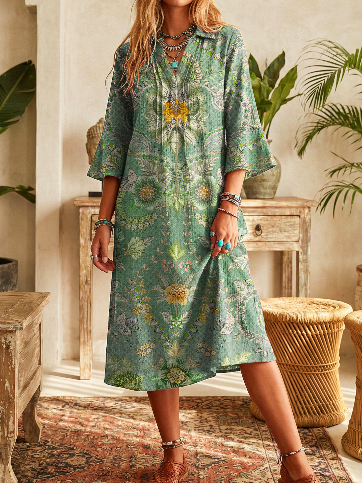 Women's Vintage Ethnic Green Floral Art Printed Casual Flap Button Down Shirt Dresses