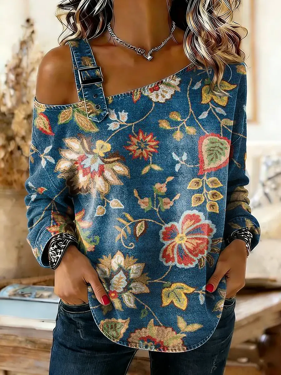 Women's Vintage Floral Print Artistic Long-sleeve Tank Top In Washed Cotton Denim