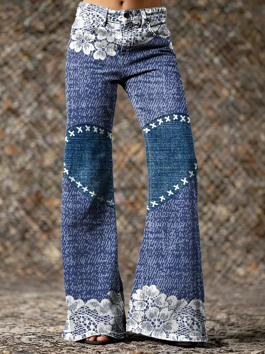 Women's Vintage Lace Heart Pattern Art Print Washed Denim Jeans