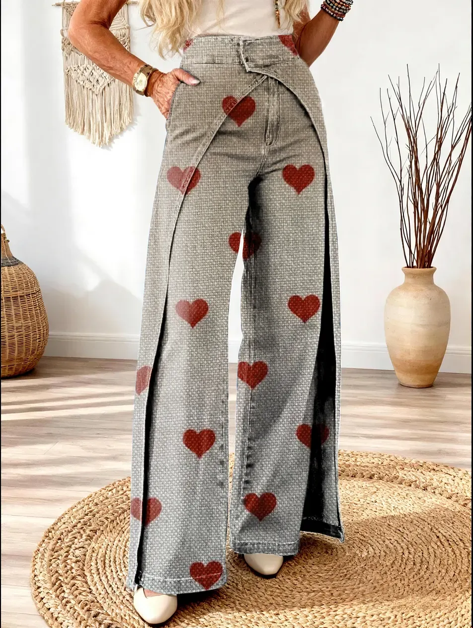 Women's Vintage Red Heart Art Print Casual Washed Cotton Denim Jeans