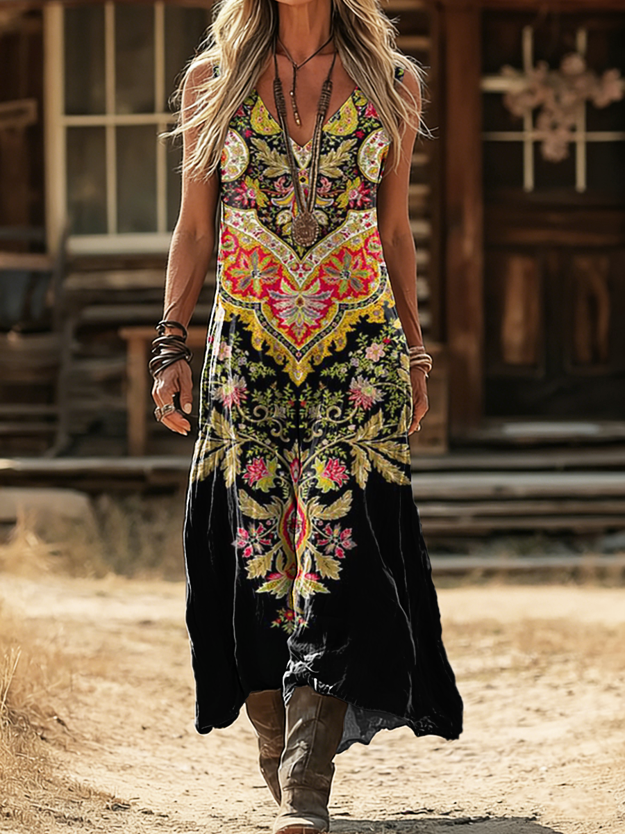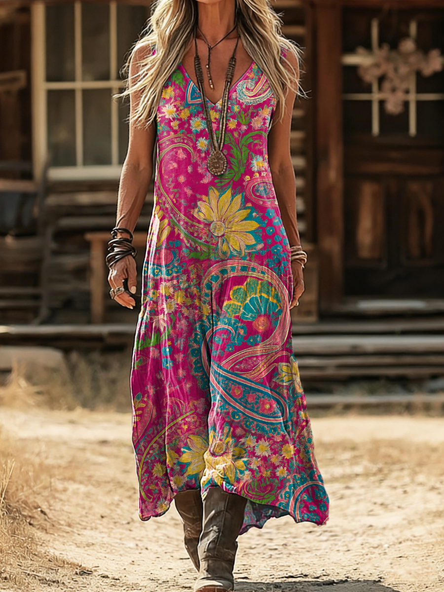 Women's Retro Bohemian Paisley Art Print Casual Sleeveless V-Neck Cotton Linen Dress