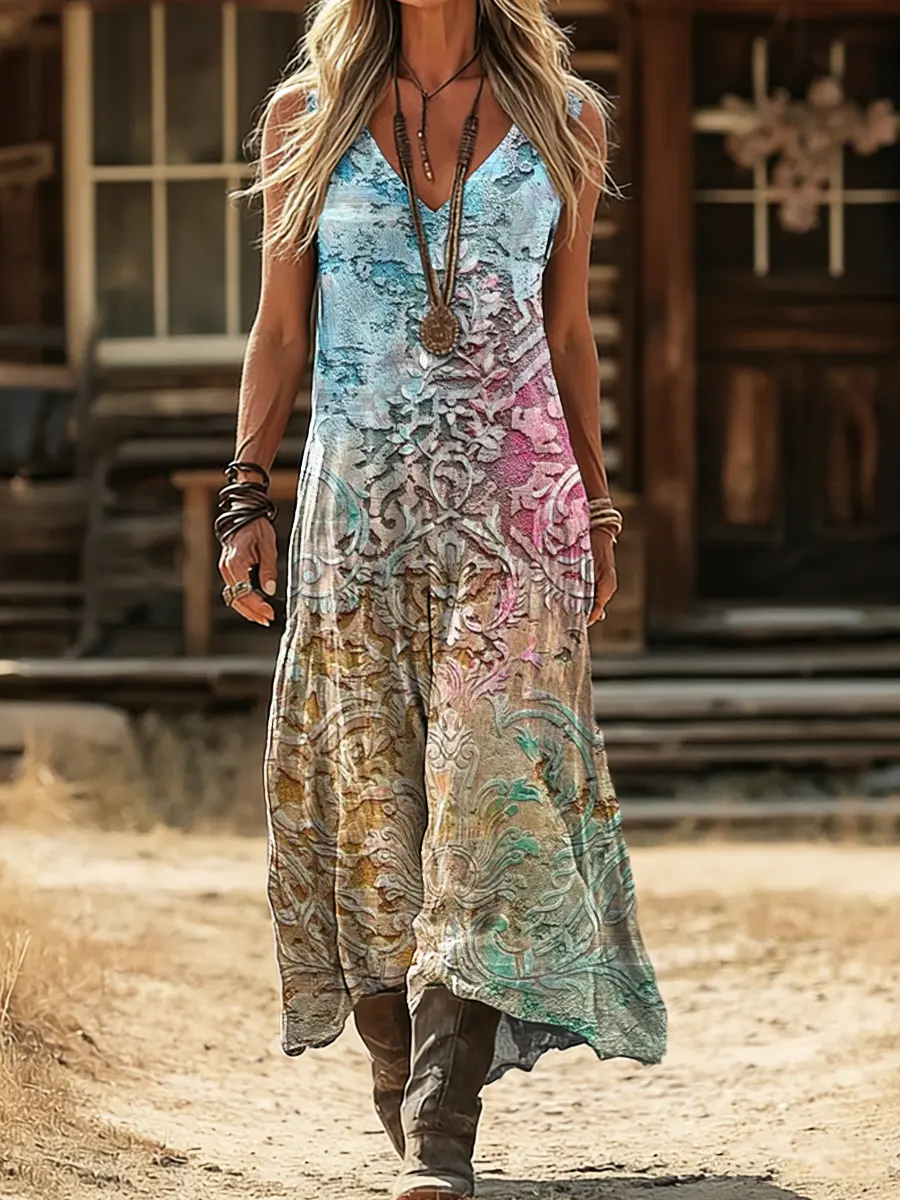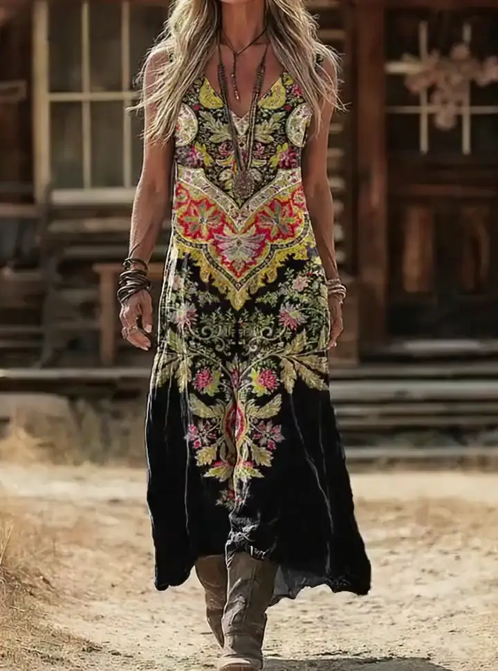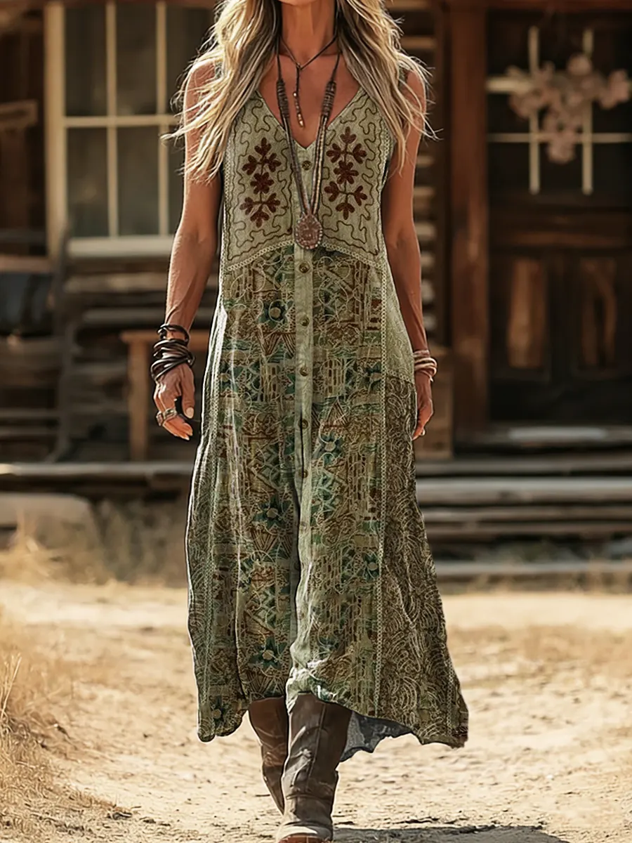 Women's Retro Bohemian Art Print Casual Sleeveless V-Neck Cotton Linen Dress