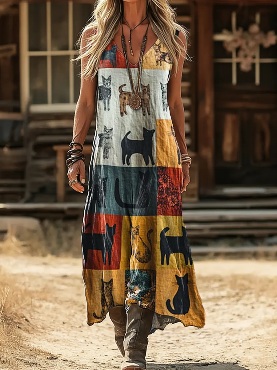 Women's Retro Colorful Art Print Casual Sleeveless V-Neck Cotton Linen Dress