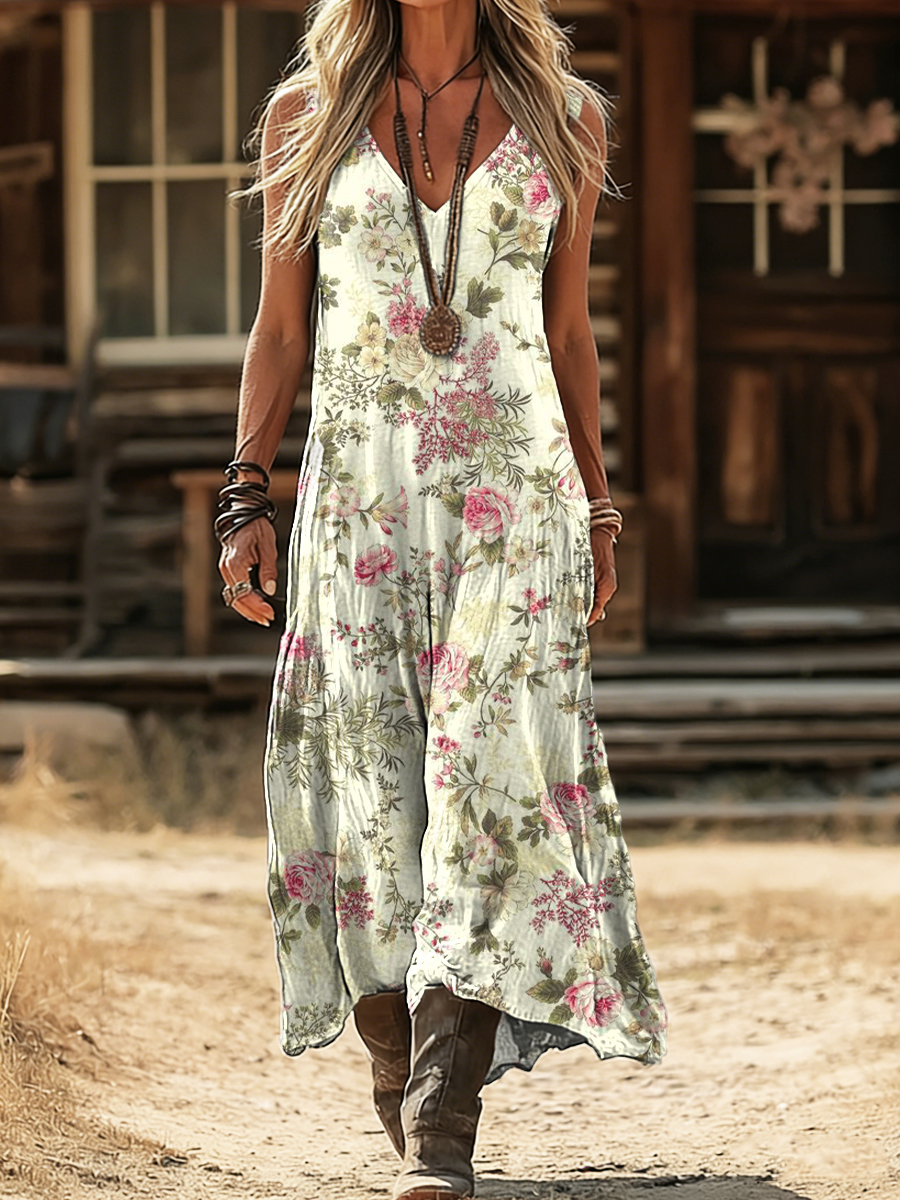 Women's Bohemian Floral Print Artistic Sleeveless V-neck Dress With Pockets