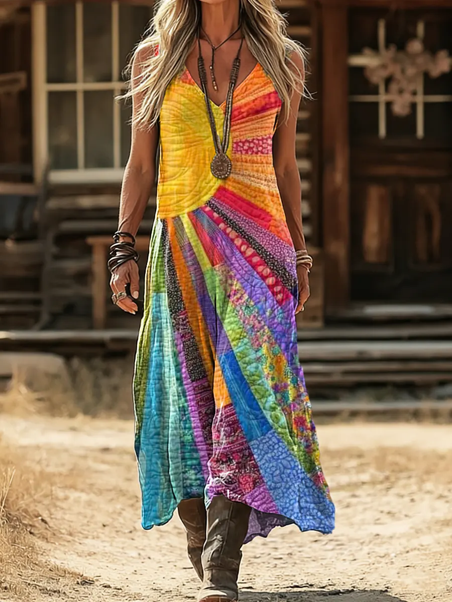 Women's Bohemian Multicolor Patchwork Sun-printed Artistic Sleeveless V-neck Dress With Tie-front Pockets