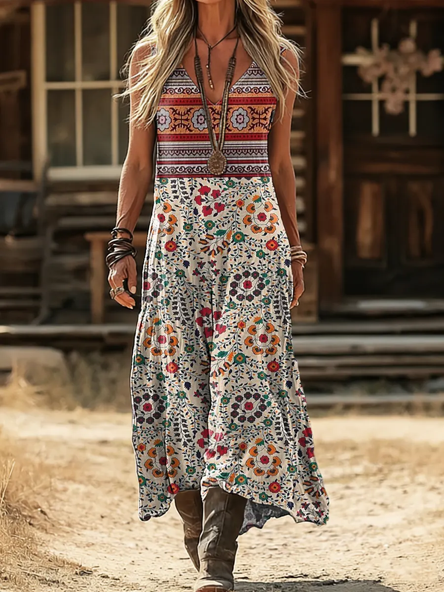 Women's Retro Colorful Bohemian Floral Art Print Casual Sleeveless V-Neck Cotton Linen Dress