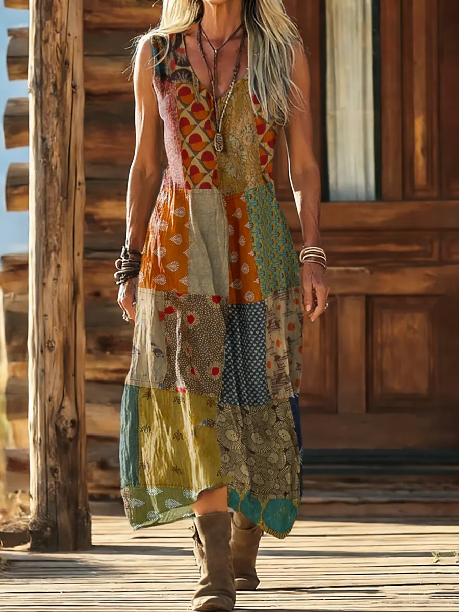 Women's Vintage Patchwork Art Print Sleeveless Cotton Dress With Pockets