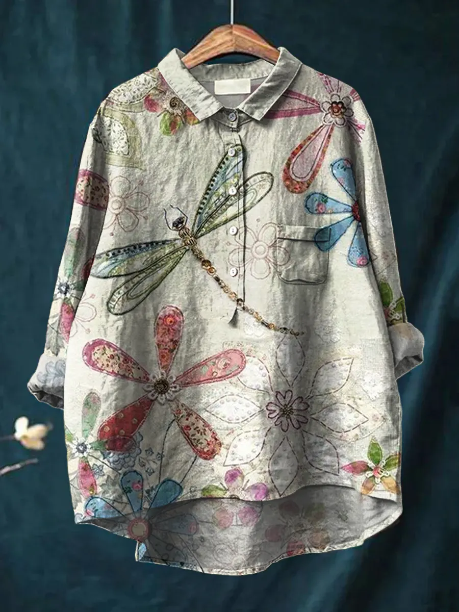 Dragonfly Floral Art Print Casual Cotton And Linen Shirt