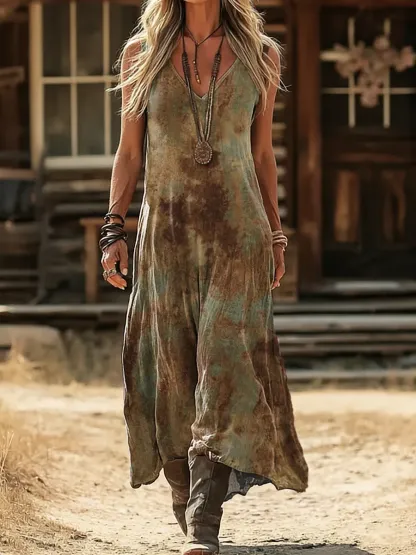 Ethnic Tie Dye Weathered Look Women's Print No Sleeve Pocket Cotton Dress