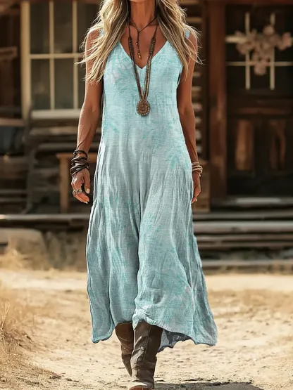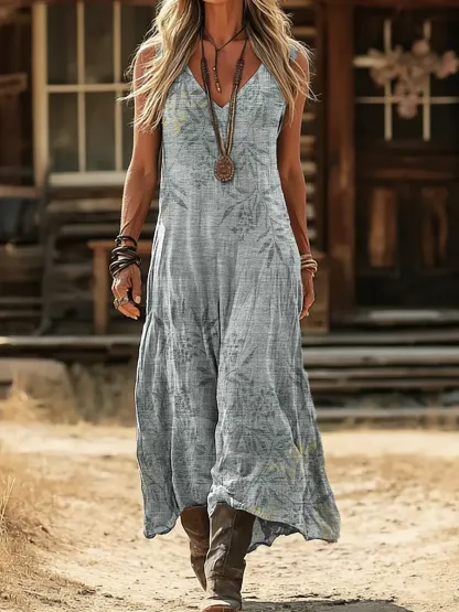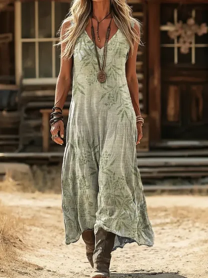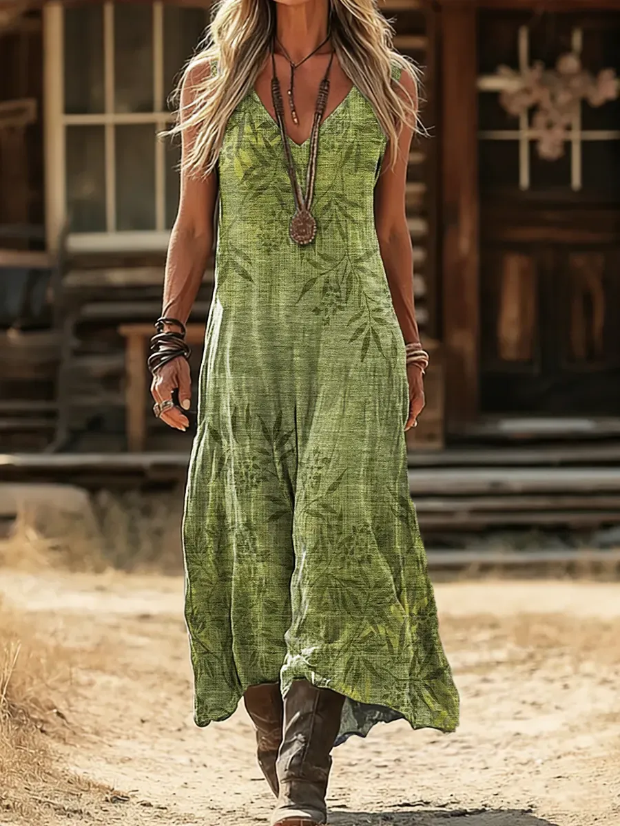 Ethnicity Bamboo Leaves Women's Print No Sleeve Pocket Cotton Dress