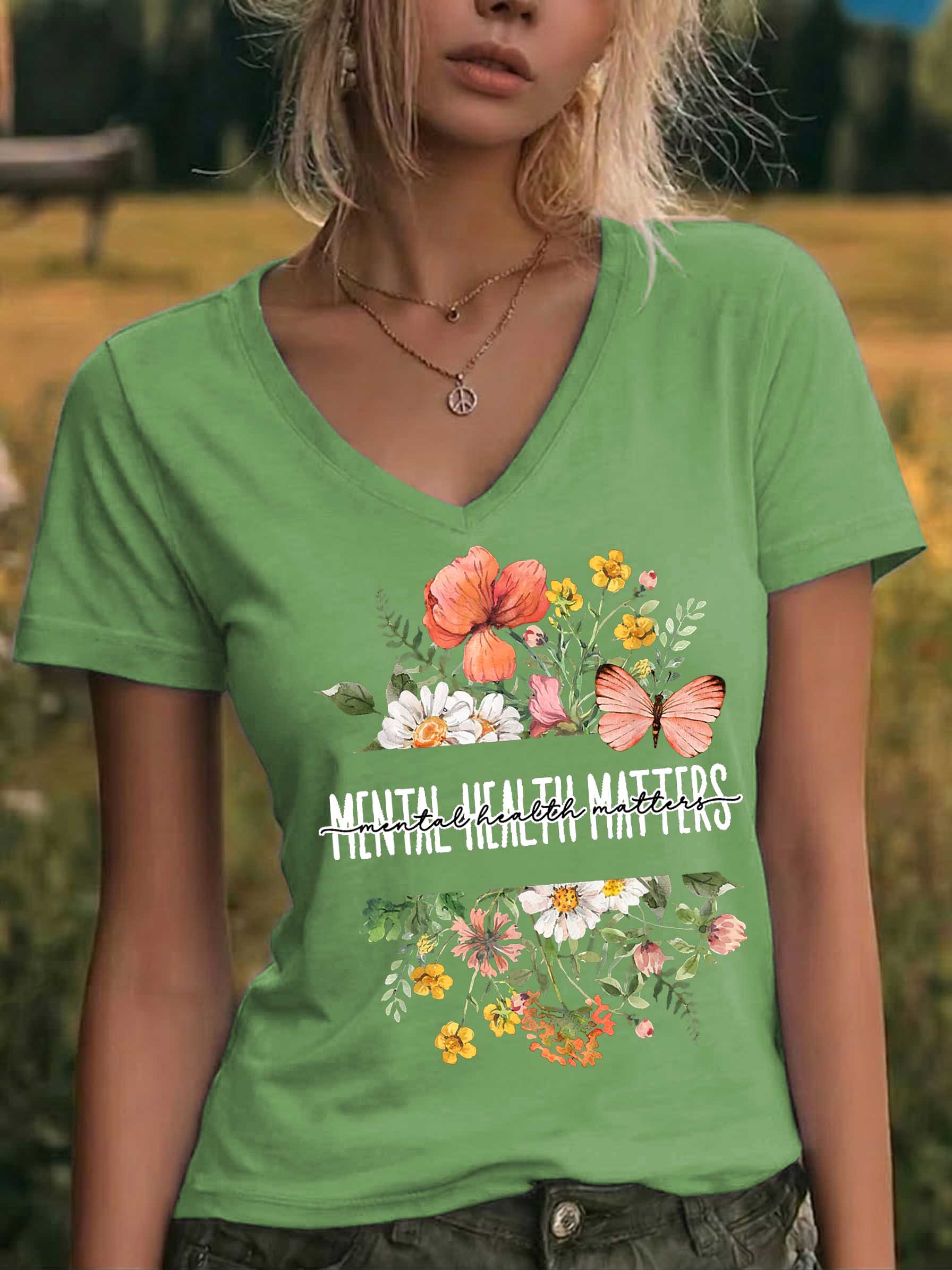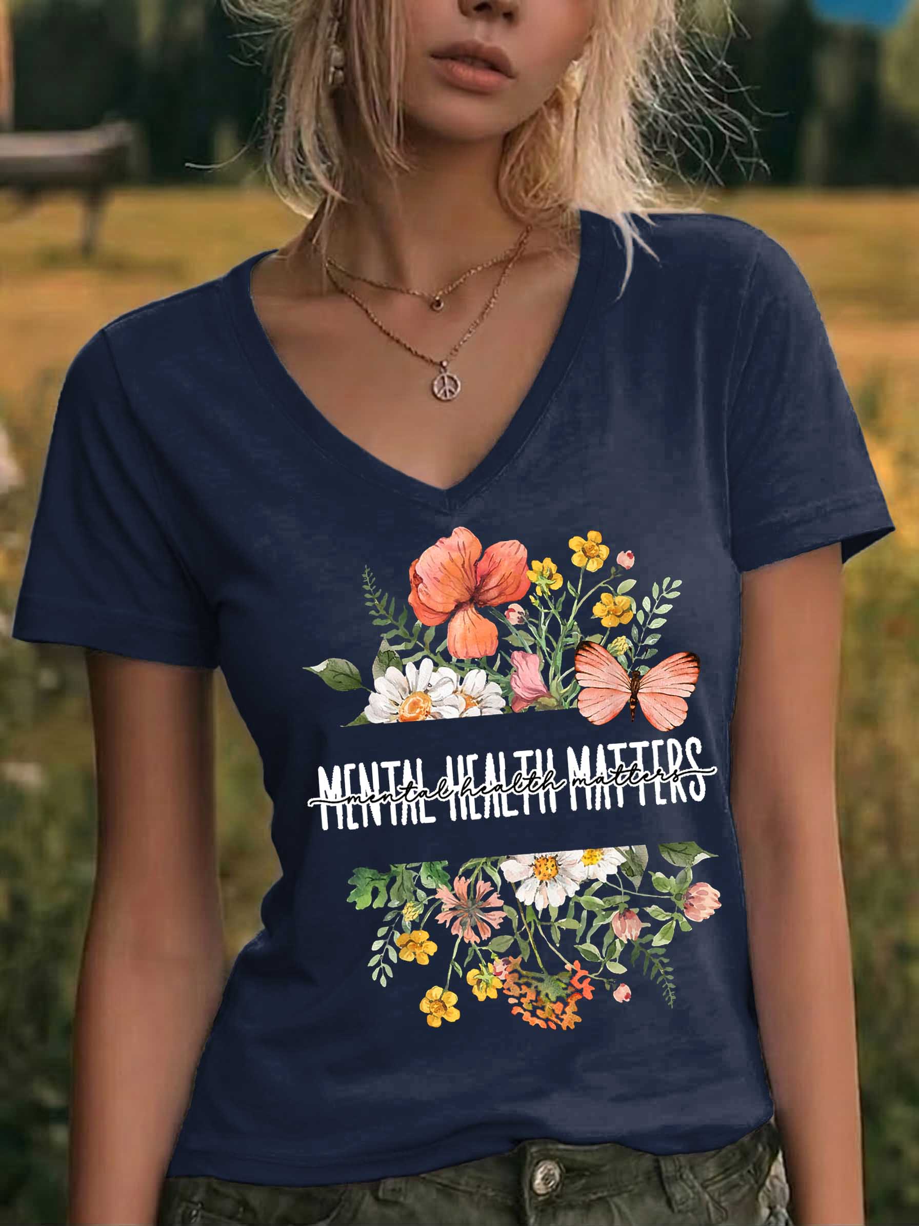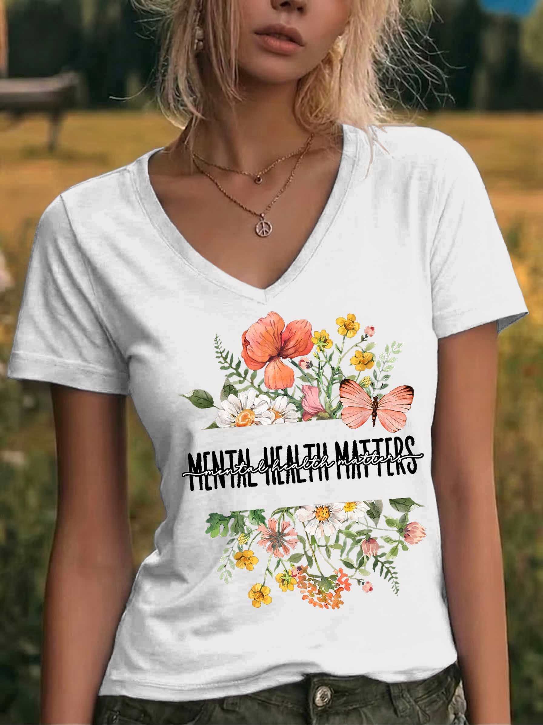 Mental Health Matters Floral V-neck Casual T-shirt