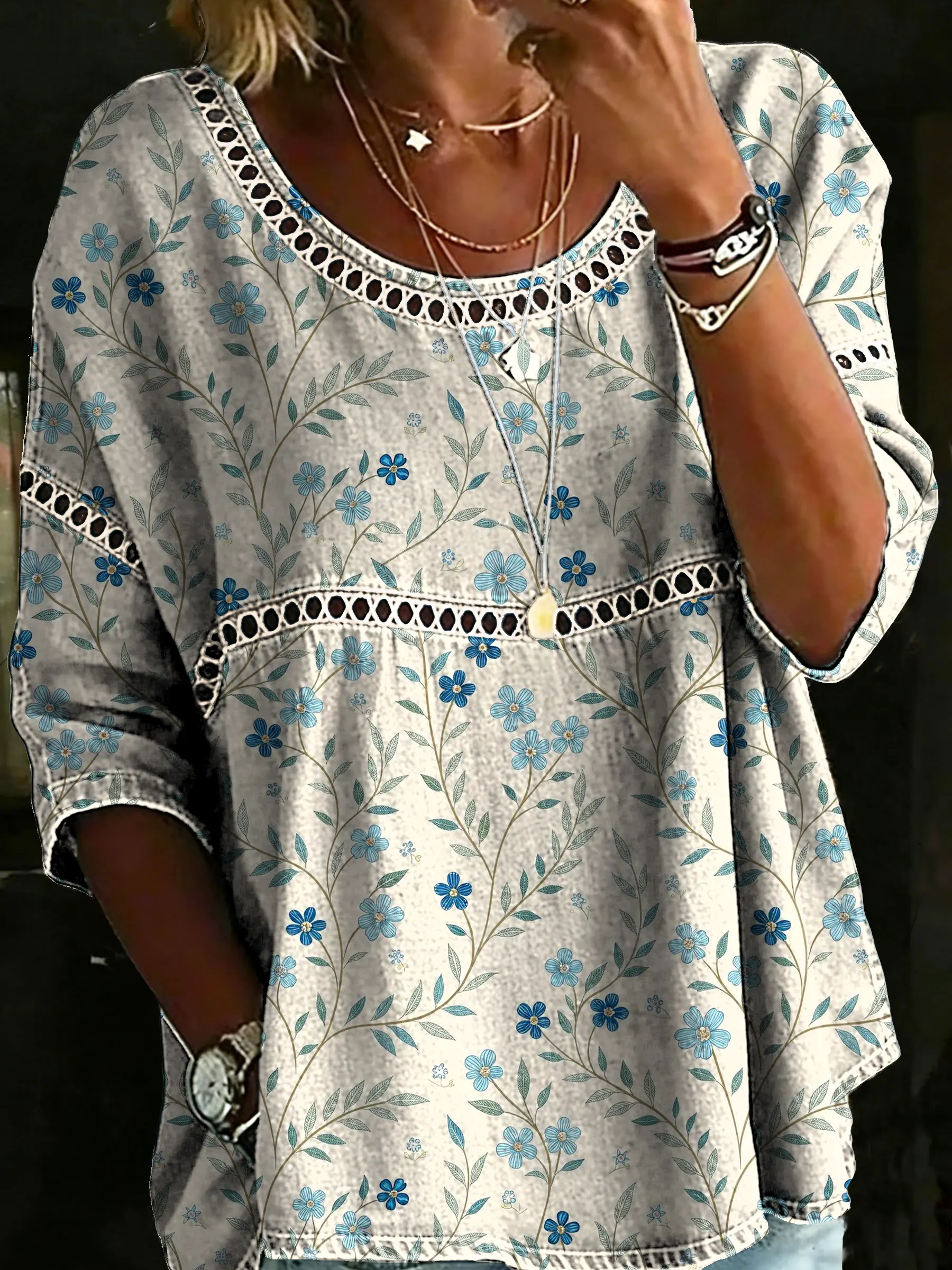 Retro-chic Blue Small Floral Artistic Print Casual Round-neck Cutout Patchwork Shirt