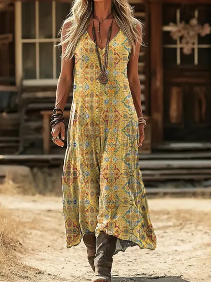 Retro Ethnic Totem Women's Print No Sleeve Pocket Cotton Dress