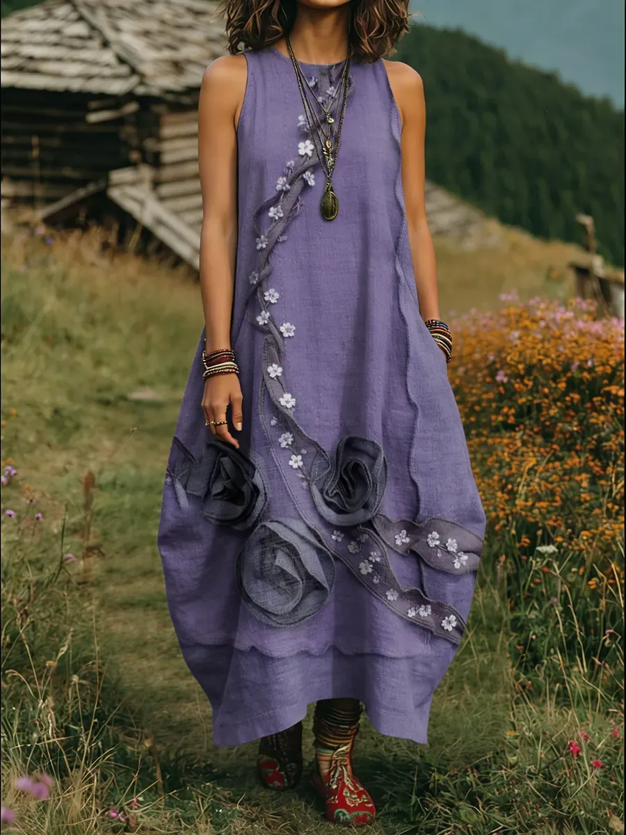 Women's Floral Art Print Round Neck Sleeveless Cotton Pocket Dress