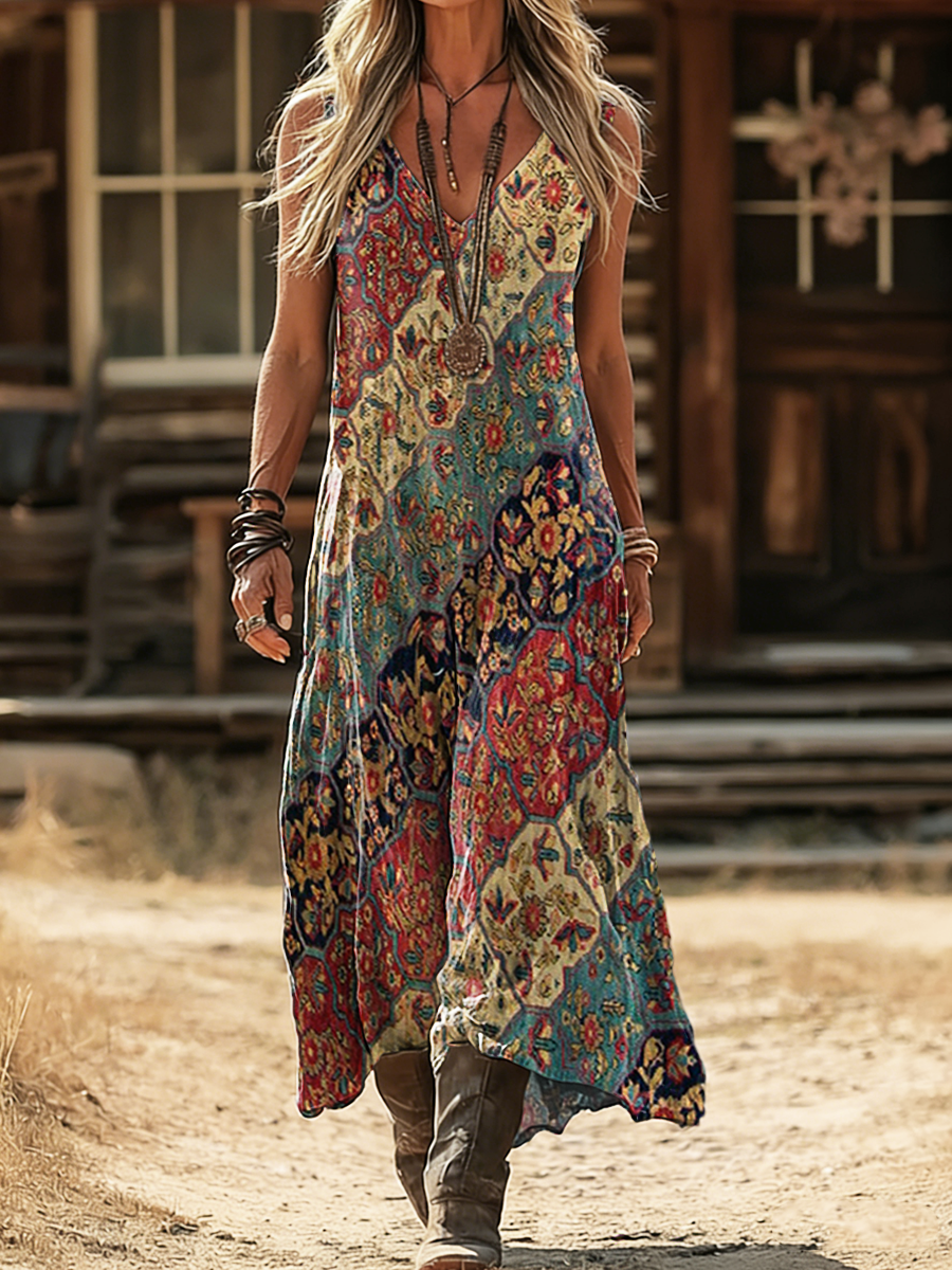 Women's Retro Ethnic Twill Print Casual Sleeveless V-Neck Cotton Linen Dress