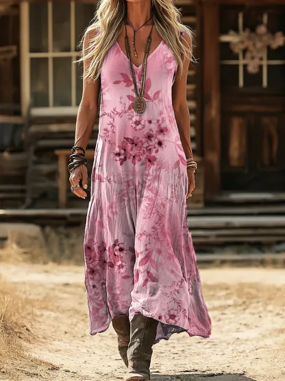 Women's Vintage Ethnic Pink Floral Art Printed Casual V-neck Pocket Sleeveless Cotton Dresses