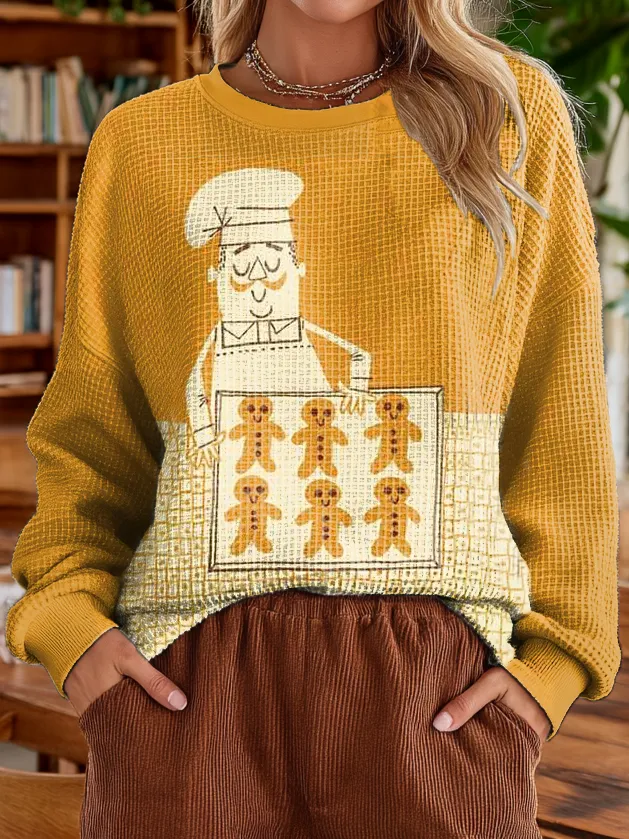 Women's Vintage Yellow Cute Gingerbread Man Christmas Art Print Casual Round Neck Pullover Waffle Sweatshirt