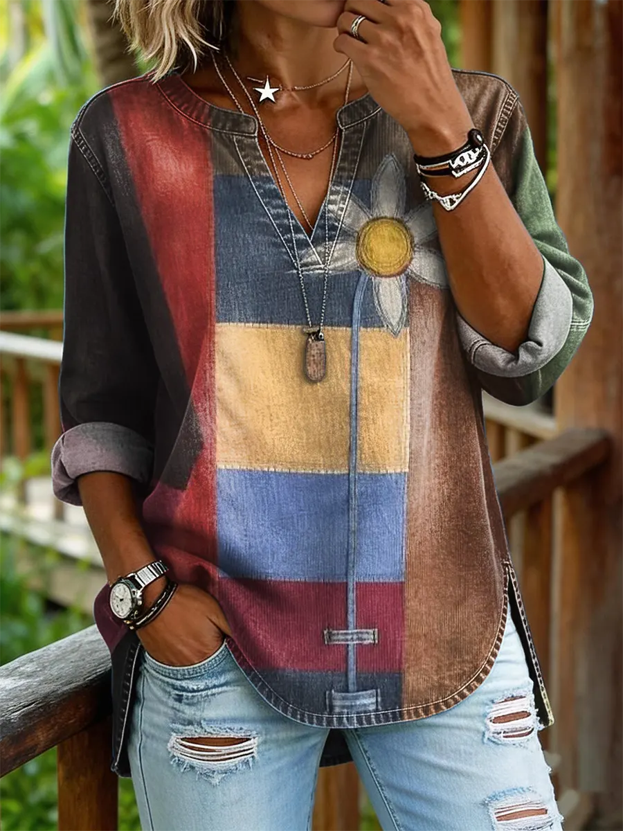 Women's Vintage-Style Colorful Abstract Geometric Art Print Casual Long-Sleeve V-Neck Washed Cotton Denim Top