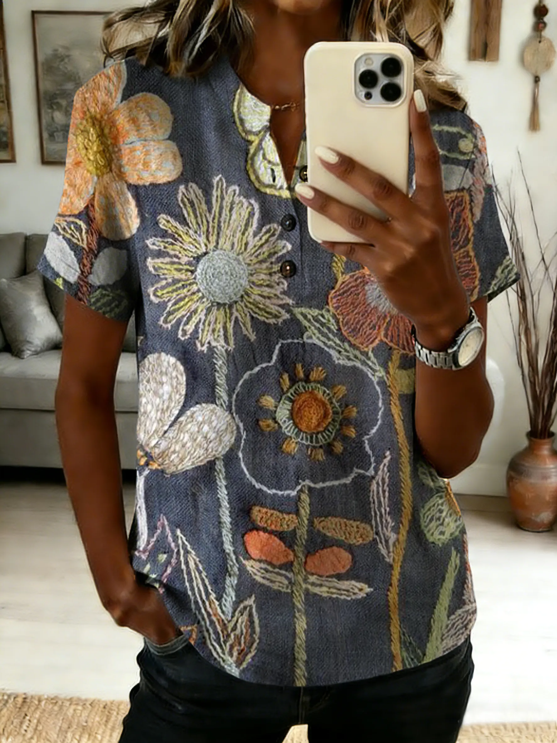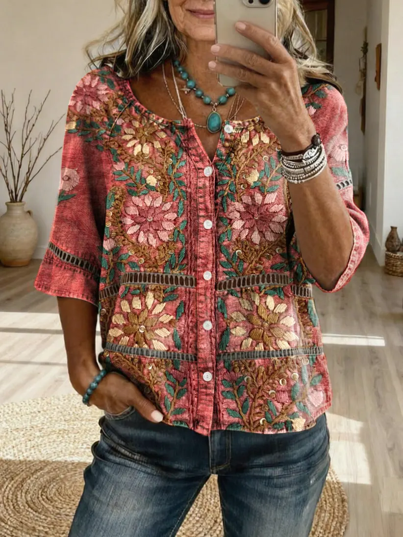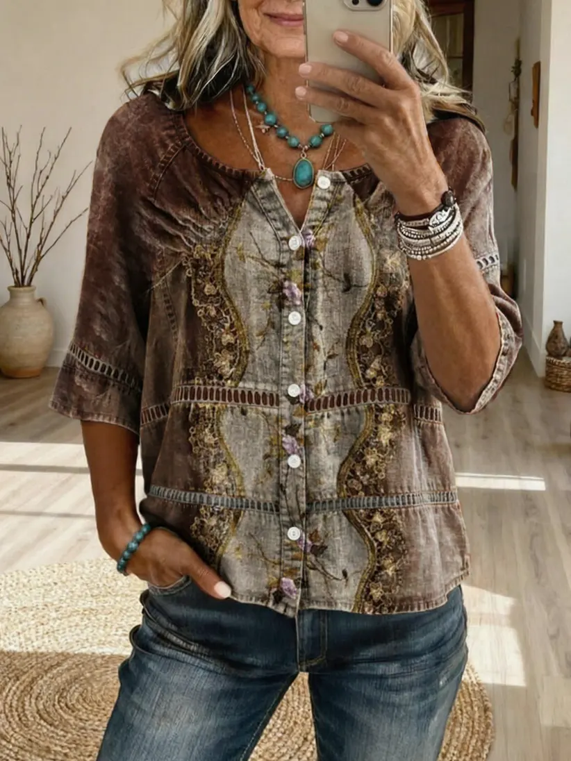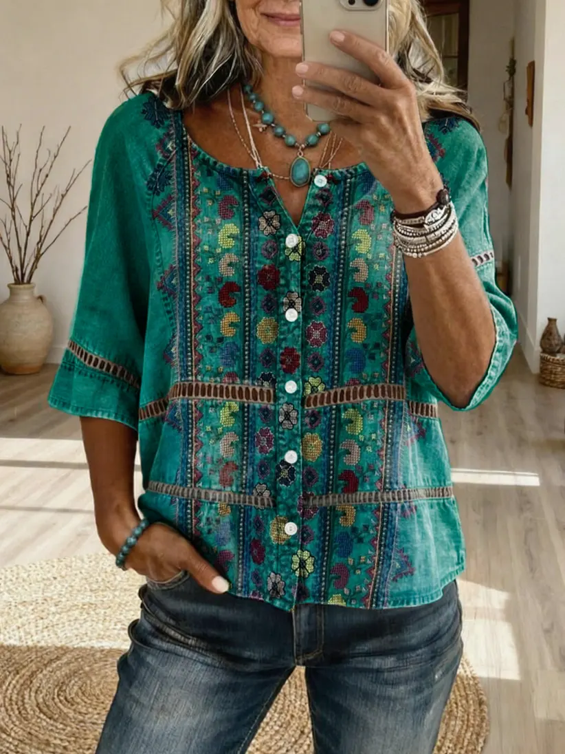 Women's Bohemian Ethnic-Textured Floral Art Print Casual V-Neck Washed Cotton Denim Top