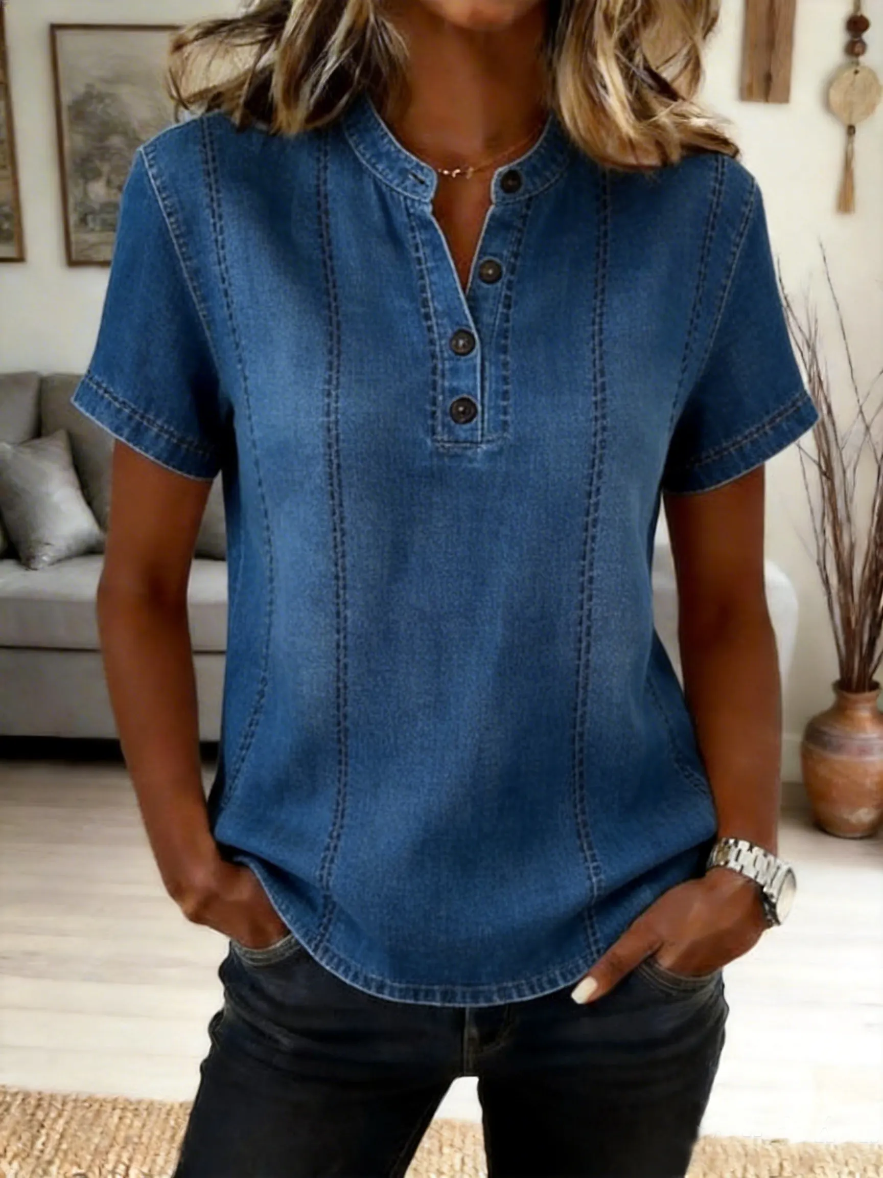 Women's Retro Bohemian Hippie Art Print Casual V-Neck Washed Cotton Denim Top