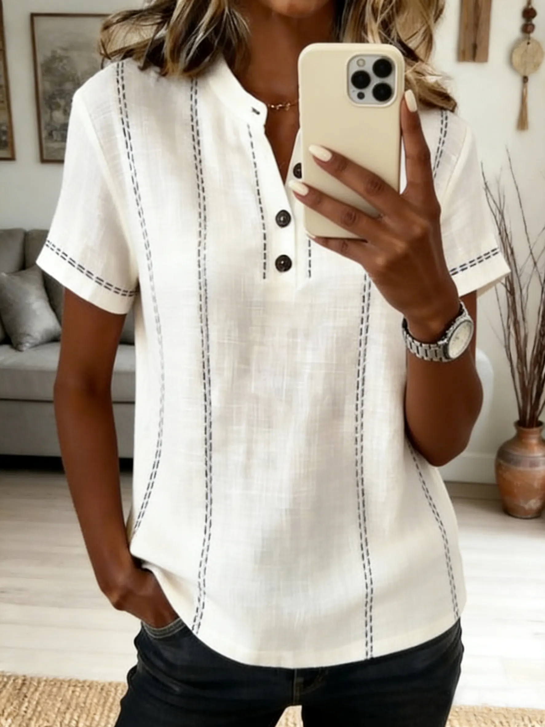 Women's Retro-Patterned Artistic Print Casual Short-Sleeve Top