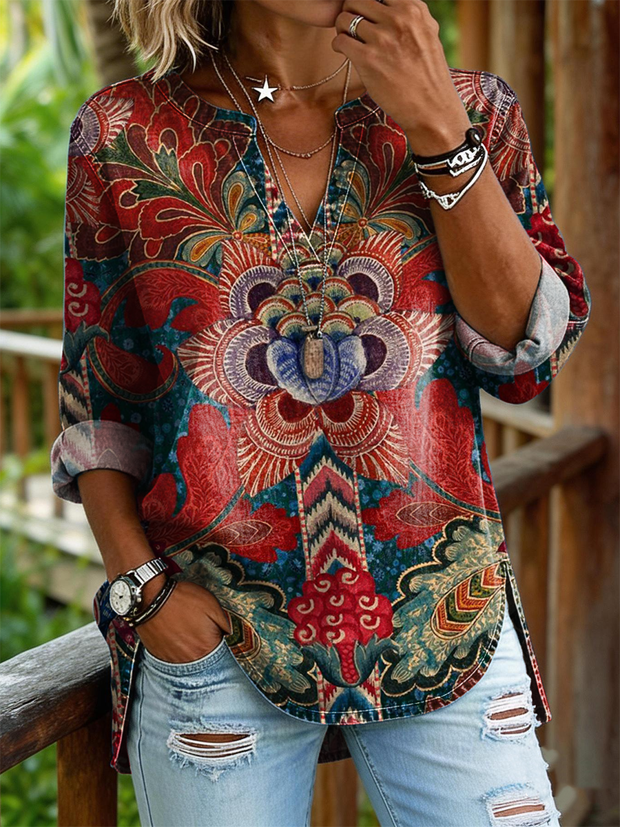 Women's Retro Ethnic Floral Art Print Casual Long-sleeve V-neck Shirt