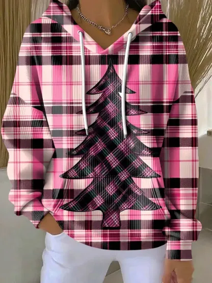 Christmas Tree Plaid Print Casual Hoodie Sweatshirt
